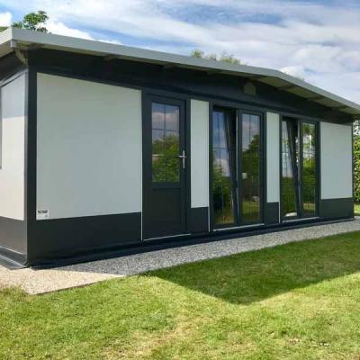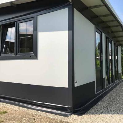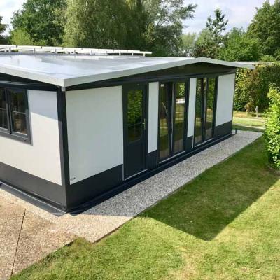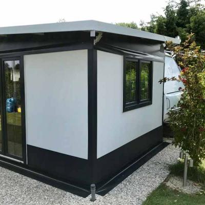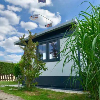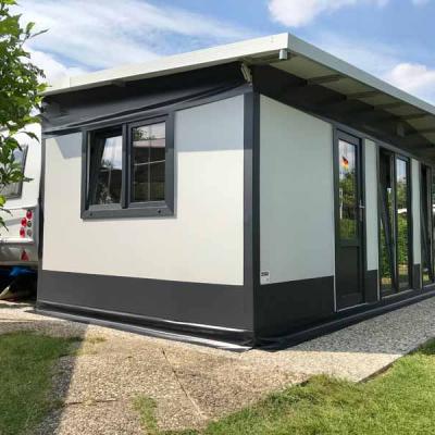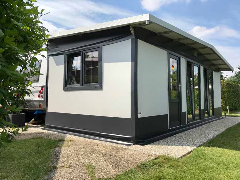 Die Verglasung enthält innenliegende Sprossen. Das freistehende Dauerstandszelt wird mit Anpresswülsten wind- und wetterdicht, sodass die Mobilität des Wohnwagens nicht eingeschränkt wird. Mit integrierter Regenrinne fließt auch das hamburgische Regenwetter kontrolliert ab - und kann bei Bedarf aufgefangen werden.